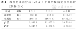 两组患儿治疗后随访6个月时,观察组疾病复发率为8.9%(11/124),显著低于对照组的32.3%(40/124),差异有统计学意义(P<0.05),见表4。