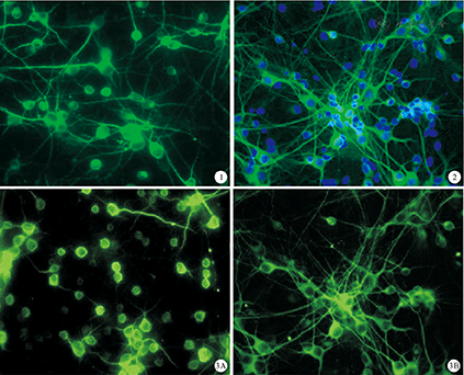 新生SD大鼠海马神经元细胞在体外培养30 min时,大部分细胞开始贴壁,呈圆形或椭圆形,体积小,单个均匀分布;培养2 h后,细胞贴壁明显,少数细胞开始长出突起;3 d后神经元细胞体增大,突起延长。新生大鼠神经元细胞体外培养至第7天时,神经元分化成熟,细胞质丰富,树突及轴突舒展延长,见图1。对3只新生SD大鼠6份体外培养7 d的大鼠海马神经元细胞采用anti-MAP2-FITC免疫荧光染色方法,经NIS-Elements AR 3.00, SP7 (Build 547)图像分析软件分析10个视野下的100个细胞,神经元细胞纯度为96.3%,且细胞生长状况良好,形态优美,神经纤维交织成网状,见图2。