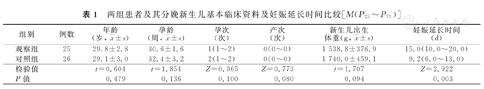 所有患者均接受剖宫产术终止妊娠,分娩活胎。两组患者年龄、孕龄、孕次及产次等基本临床资料,以及两组新生儿出生体重比较,差异均无统计学差异(P>0.05),见表1。观察组中位妊娠延长时间较对照组高,差异有统计学意义(Z=2.922,P=0.003),见表1。
