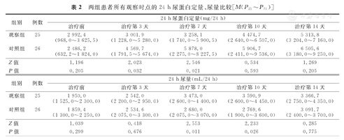 治疗前、治疗第10及14天时,两组患者24 h尿蛋白定量分别比较,差异均无统计学意义(P>0.05)。治疗第3、7天时,观察组24 h尿蛋白定量均较对照组低,差异均有统计学意义(Z=2.023,P=0.032;Z=2.546,P=0.021)。治疗前、治疗第3、14天时,两组患者24 h尿量分别比较,差异均无统计学意义(P>0.05)。治疗第7、10天时,观察组24 h尿量均较对照组高,差异均有统计学意义(Z=2.553,P=0.011;Z=2.233,P=0.026)。两组患者所有观察时点的24 h尿蛋白定量、尿量比较,见表2。