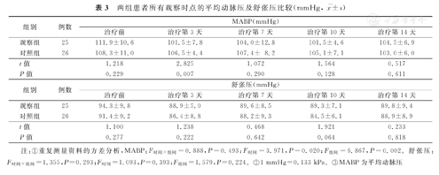治疗第3天时,观察组患者MABP较对照组低,差异有统计学差异(t=2.825,P=0.007)。治疗前、治疗第7、10与14天时,两组MABP分别比较,差异均无统计学差异(P>0.05)。两组患者所有观察时点的舒张压分别比较,差异均无统计学差异(P>0.05),见表3。