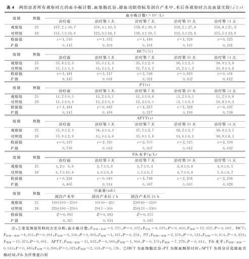 两组患者所有观察时点的血小板计数、PT分别比较,差异均无统计学意义(P>0.05)。治疗第3天、7天时,观察组HCT均较对照组低,差异有统计学意义(t=3.117,P=0.001;t=2.546,P=0.021)。治疗第3、7、10及14天时,观察组APTT均较对照组显著延长,差异均有统计学意义(P<0.05)。治疗第10、14天时,观察组Fib水平均较对照组低,差异均有统计学意义(t=2.208,P=0.035;t=2.238,P=0.028)。两组患者剖宫产术中、术后2及24 h出血量分别比较,差异均无统计学差异(P>0.05)。两组患者所有观察时点的血小板计数、HCT、凝血功能指标及出血量比较,见表4。