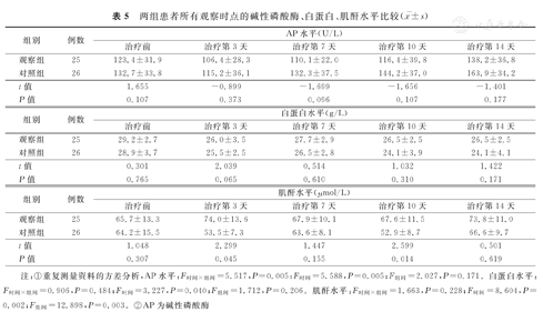 两组患者所有观察时点的AP、白蛋白水平分别比较,差异均无统计学意义(P>0.05)。治疗第3、10天时,观察组肌酐水平均较对照组高,差异均有统计学意义(t=2.299,P=0.045;t=2.599,P=0.014),见表5。