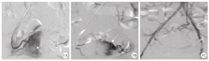 介入组孕妇采用UAE联合剖宫产术引产:让孕妇仰卧于数字减影血管造影(digital subtraction angiography,DSA)台,常规消毒、铺巾,积极扩容、补液支持治疗,术前30 min经股动脉穿刺子宫动脉置管,待胎儿剖宫产娩出、剥离胎盘后,立即于双侧髂内动脉予DSA造影剂进行造影(造影剂流速为4 mL/s,流量为8 mL),X射线摄片结果显示双侧子宫动脉粗大、迂曲,其中子宫动脉供血区域可见少量造影剂外溢表现,导管分别进入双侧子宫动脉,栓入适量明胶海绵颗粒,待DSA造影复查结果显示双侧子宫动脉栓塞完全,则栓塞术毕拔管、加压包扎,孕妇无特殊不适,即可平安送回病房。对照组仅采用剖宫产术引产:胎儿剖宫产娩出后,于孕妇子宫肌层内注射缩宫素及卡前列素氨丁三醇,同时按摩子宫,剥离胎盘,若创面出血量较大,则采取"8"字缝扎、宫腔内纱布填塞压迫及输血等处理,若上述处理后仍不能止血,则采取双侧UAE,若仍不能止血,则为了挽救患者生命,而进行子宫切除术。