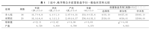 2组中、晚孕期合并前置胎盘孕妇年龄、孕次、产次、孕龄及前置胎盘类型构成比比较,差异均无统计学意义(P>0.05),见表1。