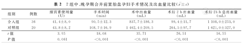 2组中、晚孕期合并前置胎盘孕妇手术情况及出血量比较(