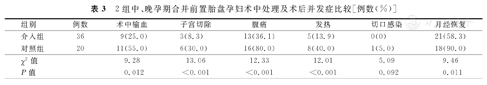 | 组别 | 例数 | 术中输血 | 子宫切除 | 腹痛 | 发热 | 切口感染 | 月经恢复 |