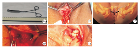 新式阴道前壁补片修补术中,患者取膀胱截石位,常规消毒外阴,铺无菌巾单,再次常规消毒外阴及阴道。接受经阴道子宫切除的SUI患者,需进行硬膜外麻醉或全身麻醉;单纯接受阴道前壁修补术的SUI患者,以0.5%盐酸利多卡因注射液10~15 mL,在阴道黏膜下间隙和双侧耻骨后间隙进行局部麻醉。麻醉完成后,在尿道外口下方约1.5 cm处向宫颈方向纵行切开阴道壁2.0 cm,如果合并阴道前壁膨出,则相应延长4.0~6.0 cm,切口深度达尿道膀胱筋膜。然后,采用本研究设计的"YGP-Ⅱ型阴道前壁穴道分离补片放置复合钳" (中国实用新式专利,专利号:ZL 2015 2 0195696.2,图1A),在尿道膀胱筋膜间隙旁侧,水平向下角度为5°~10°处,沿耻骨降支内侧间隙向内分离出一条穴道,深度为5.0~7.0 cm,宽度为1.0~1.5 cm(图1B)。手术路径位于耻骨降支内侧6~8 cm(图1C)。裁剪补片(商品名:嘉美诗,美国Ethicon Endo-Surgery,LLC公司)长度为10.0 cm,宽度为1.0~1.2 cm,将补片两端分别置入双侧穴道内,在尿道筋膜处以4号丝线固定补片(图1D),对合并阴道前壁膨出者,可剪除多余膨出组织,用可吸收线缝合阴道壁(图1E)。术后留置导尿管,24 h后拔除;阴道内放置碘伏纱布卷或油纱卷压迫止血,24 h后取出。