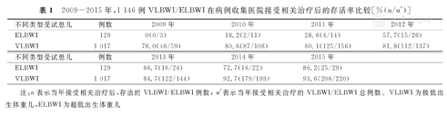 本研究符合纳入、排除标准的1 146例VLBWI/ELBWI中,早产儿为1 141例,足月儿为5例;VLBWI为1 017例,ELBWI为129例;男性与女性VLBWI/ELBWI性别比为569∶577;胎龄为24+5~39+6周,平均为(31.0±2.3)周;出生体重最低为397 g,平均为(1 255±185)g;单胎为629例,双胎为484例,3胎为31例,4胎为2例;存活率为83.3%(955/1 146),VLBWI存活率为86.2%(877/1 017),ELBWI存活率为60.5%(78/129);死亡(住院治疗死亡及放弃治疗后死亡)VLBWI/ELBWI为191例,占纳入受试者的16.7%(191/1 146),死亡VLBWI/ELBWI中,放弃治疗者所占比例为73.8%(141/191)。2009-2015年符合本研究纳入与排除标准的1 146例VLBWI/ELBWI在本院接受相关治疗后,其存活率呈逐年升高趋势,见表1。