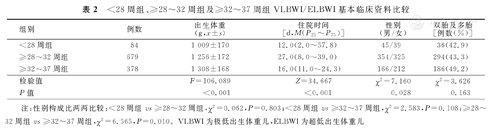 <28周组,≥28~32周组及≥32~37周组VLBWI/ELBWI的出生体重随着其胎龄增加,逐渐增加,3组比较,差异有统计学意义(F=106.089,P<0.001)。3组受试者住院时间随着其胎龄增加,逐渐缩短,3组受试者比较,差异亦有统计学意义(Z=34.667,P<0.001)。3组受试者双胎及多胎发生率比较,差异无统计学意义(P>0.05)。3组受试者性别构成比比较,差异有统计学意义(χ2=7.160,P=0.028),<28周组与≥28~32周组、≥32~37周组比较,差异均无统计学意义(P>0.05),≥28~32周组与≥32~37周组比较,差异有统计学意义(χ2=6.565,P=0.010)。本研究<28周组、≥28~32周组及≥32~37周组VLBWI/ELBWI基本临床资料比较,见表2。