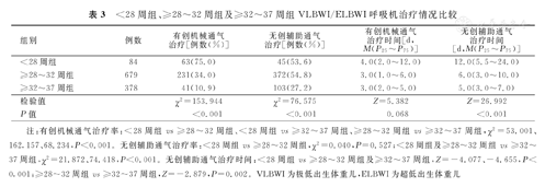 <28周组,≥28~32周组及≥32~37周组有创机械通气治疗率、无创辅助通气治疗率及无创辅助通气治疗时间分别比较,差异均有统计学意义(P<0.001)。3组有创机械通气治疗时间比较,差异无统计学意义(P>0.05)。3组有创机械通气治疗率不同胎龄组两两比较,差异均有统计学意义(P<0.05)。无创辅助通气治疗率不同胎龄组两两比较:<28周组与≥28~32周组比较,差异无统计学意义(P>0.05);<28周组及≥28~32周组与≥32~37周组比较,前2组无创辅助通气治疗率均显著高于后者,差异均有统计学意义(χ2=21.872、74.418,P<0.001)。3组无创辅助通气治疗时间不同胎龄组两两比较,差异均有统计学意义(P<0.05)。<28周组、≥28~32周组及≥32~37周组VLBWI/ELBWI呼吸机治疗情况比较,见表3。