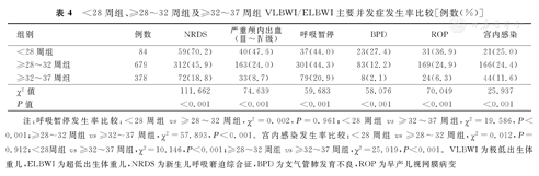 注:呼吸暂停发生率比较:<28周组vs ≥28~32周组,χ2=0.002,P=0.961;<28周组vs ≥32~37周组,χ2=19.586,P<0.001;≥28~32周组vs ≥32~37周组,χ2=57.893,P<0.001。宫内感染发生率比较:<28周组vs ≥28~32周组,χ2=0.012,P=0.912;<28周组vs ≥32~37周组,χ2=10.146,P<0.001;≥28~32周组vs ≥32~37周组,χ2=25.019,P<0.001。VLBWI为极低出生体重儿,ELBWI为超低出生体重儿,NRDS为新生儿呼吸窘迫综合征,BPD为支气管肺发育不良,ROP为早产儿视网膜病变