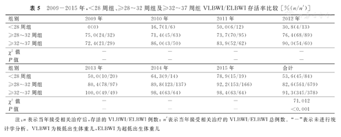 2009-2015年,<28周组、≥28~32周组及≥32~37周组VLBWI/ELBWI存活率比较 [%(n/n′)]