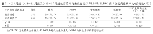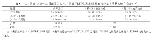 本研究<28周组、≥28~32周组及≥32~37周组VLBWI/ELBWI中,放弃治疗VLBWI/ELBWI与未放弃治疗的VLBWI/ELBWI的呼吸系统疾病(NRDS、呼吸衰竭)患病率分别比较,差异均有统计学意义(P<0.001)。放弃治疗与未放弃治疗VLBWI/ELBWI的前5位疾病患病率比较,见表7。