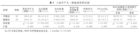 2组早产儿男性患儿所占比例、出生胎龄、出生体重、母亲产前使用激素比例、呼吸评分、OI、RDS的胸部X射线摄片Ⅱ级及Ⅲ级所占比例比较,差异均无统计学意义(P>0.05)。2组早产儿一般临床资料比较,见表1。