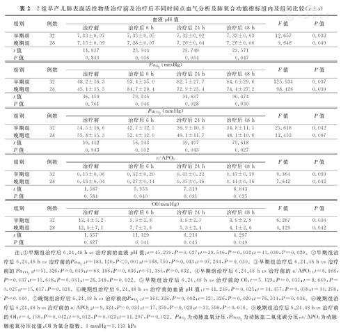 PS治疗效果组内比较:①2组早产儿PS治疗后6、24、48 h的血液pH值、PaO2及a/APO2均分别较本组早产儿治疗前高,而OI均较本组早产儿治疗前低,并且差异均有统计学意义(P<0.05);②早期组早产儿PS治疗后6、24、48 h的PaCO2,均分别较治疗前低,并且差异均有统计学意义(P<0.05);③晚期组早产儿PS治疗前及治疗后6、24、48 h的PaCO2比较,差异均无统计学意义(P>0.05)。2组早产儿PS治疗前、后不同时间点血气分析及氧合功能指标组间比较,见表2。