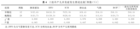 | 组别 | 例数 | 肺部感染 | BPD | ICH | 肺出血 | 气胸 | ROP | 新生儿坏死性小肠结肠炎 |