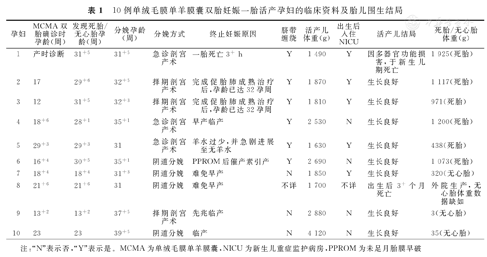 10例单绒毛膜单羊膜囊双胎妊娠一胎活产孕妇的临床资料及胎儿围生结局