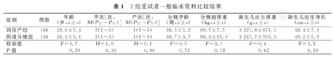 | 阴道分娩组 | 146 | 28.2±5.1 | 2(1~3) | 1(1~1) | 38.7±3.7 | 68.3±11.3 | 3 247.7±505.3 | 49.2±5.9 |