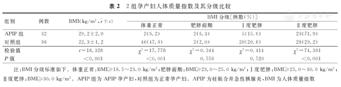 APIP组孕产妇BMI高于对照组,2组比较,差异有统计学意义(P<0.001)。APIP组孕产妇体重正常者所占比例低于对照组,而Ⅱ度肥胖者所占比例明显高于对照组,2组比较,差异均有统计学意义(P<0.05)。但是,2组孕产妇肥胖前期和Ⅰ度肥胖者所占比例分别比较,差异均无统计学意义(P>0.05)。2组孕产妇BMI及其分级比较,见表2。