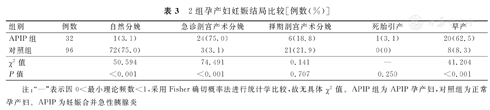 注:"—"表示因0<最小理论频数<1,采用Fisher确切概率法进行统计学比较,故无具体χ2值。APIP组为APIP孕产妇,对照组为正常孕产妇。APIP为妊娠合并急性胰腺炎
