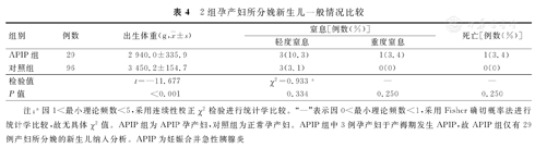 APIP组孕产妇所分娩新生儿的出生体重明显低于对照组,2组比较,差异有统计学意义(P<0.001)。2组孕产妇所分娩新生儿的轻度窒息率、重度窒息率和死亡率分别比较,差异均无统计学意义(P>0.05)。2组孕产妇所分娩新生儿一般情况比较,见表4。