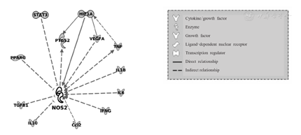 采用IPA数据库分析已有文献报道的NOS2和SFTPD基因调控网络和途径,并建立二者的分子网络图的结果显示,在IPA数据库检索到12种白细胞NOS2基因相关因素,而未检索到白细胞SFTPD基因相关因素,见图2。12种白细胞NOS2基因相关因素和免疫、炎症反应及血管生成等相关,可分为以下4类。①细胞/生长因子:由白细胞介素(interleukin,IL)相关基因,如IL-1β、-6、-10基因分别编码的IL-1β、-6与-10;TNFA基因编码的肿瘤坏死因子(tumor necrosis factor,TNF);IFNG基因编码的γ-干扰素(interferon gama,IFNG);VEGFA基因编码的血管内皮生长因子(vascular endothelial growth factor,VEGF)A,以及TGFB1基因编码的转化生长因子(transforming growth factor,TGF)-β1。②趋化因子:Ccl2基因编码的单核细胞趋化蛋白-1(monocyte chemoattractant protein-1,MCP-1)/CCL2。③酶:PTGS2基因编码的环氧合酶(cyclooxygenase,COX)-2。④转录因子:HIF1A基因编码的缺氧诱导因子(hypoxia inducible factor,HIF)-1a;STAT3基因编码的信号传导子及转录激活子(signal transducer and activator of transcription,STAT)3,以及PPARG基因编码的过氧化物酶体增殖物激活受体γ(peroxisome proliferator-activated receptor gama,PPARG)。