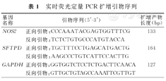 使用Oligo (dT)18引物溶液(批号:GMS12080,美国Genmed Scientifics公司)和RevertAidTM H Minus MMuLV逆转录酶试剂盒(批号:K1622,美国Thermo Fisher Scientific公司),对上述提取的总RNA逆转录成cDNA。再使用MaximaTM SYBR Green/ROX qPCR Master Mix(2X)试剂盒(批号:K0221,美国Thermo Fisher Scientific公司)对cDNA进行定量PCR检测,分析NOS2和SFTPD mRNA表达水平。根据GenBank数据库,设计引物序列,GAPDH基因为内参基因,见表1。采用实时荧光定量PCR系统(美国Applied Biosystems公司),对引物序列进行扩增。PCR扩增结束时,通过解链曲线分析,对PCR扩增产物的特异性进行检测。同时,通过对PCR扩增产物进行琼脂糖凝胶电泳,进一步验证PCR扩增产物的特异性。所有样品均设置2个复孔,取2次检测结果的平均值作为最终检测结果。NOS2和SFTPD mRNA相对表达水平,由公式2—ΔΔCt[9]计算得出。