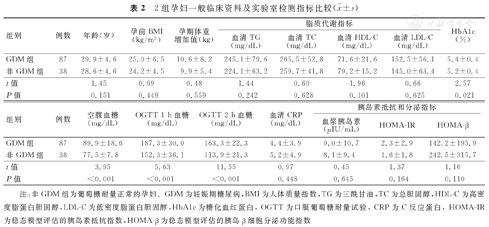 2组孕妇年龄、孕前BMI、孕期体重增加值等一般临床资料比较,差异均无统计学意义(P>0.05)。GDM组空腹与OGTT 1、2 h血糖及HbA1c,均显著高于非GDM组,并且差异均有统计学意义(P<0.05),2组孕妇脂质代谢指标(血清TG、TC、HDL-C、LDL-C),炎症指标(血清CRP),以及胰岛素抵抗和分泌指标(血浆胰岛素、HOMA-IR与HOMA-β)分别比较,差异均无统计学意义(P>0.05)。2组孕妇一般临床资料及实验室检测指标比较,见表2。