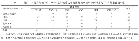 本研究437例高危型HPV DNA呈阳性受试者的组织病理学诊断结果:正常宫颈组织为149例,LSIL为60例,HSIL为215例,宫颈SCC为9例,宫颈腺癌为4例。TCT结果:无上皮内病变或恶性病变(no intraepithelial lesion or malignant,NILM)为211例,未确定意义的非典型鳞状细胞(atypical-squamous cells of undetermined significance,ASC-US)为64例,LSIL为74例,非典型鳞状上皮细胞不除外高级别鳞状上皮内病变(atypical squamous cells, cannot exclude high-grade squamous intraepithelial lesion,ASC-H)为27例,HSIL为60例,宫颈SCC为1例,见表2。