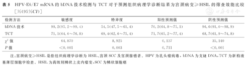 HPV-E6/E7 mRNA的bDNA技术检测与TCT对于预测组织病理学诊断结果为宫颈病变≥HSIL的筛查效能比较[%(95%CI)]