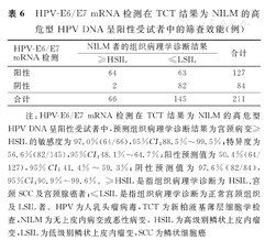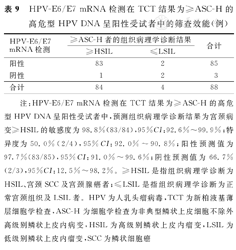 HPV-E6/E7 mRNA检测在TCT结果为NLIM和ASC-US的高危型HPV DNA呈阳性受试者中,预测组织病理学诊断结果为宫颈病变≥HSIL的敏感度(97.0%、100.0%)和阴性预测值(97.6%、100.0%)均很高,而特异度和阳性预测值却均较低。HPV-E6/E7 mRNA检测在TCT结果为LSIL的高危型HPV DNA呈阳性受试者中,预测组织病理学诊断结果为宫颈病变≥HSIL的敏感度(97.8%)很高,特异度和阳性预测值较低,阴性预测值较高(90.9%)。HPV-E6/E7 mRNA检测在TCT结果为宫颈病变≥ASC-H的高危型HPV DNA呈阳性受试者中,预测组织病理学诊断宫颈病变≥HSIL的敏感度(98.8%)和阳性预测值(97.7%)均很高,而特异度和阴性预测值却均较低。HPV-E6/E7 mRNA检测在不同TCT结果的高危型HPV DNA呈阳性受试者中的筛查效能,见表6,表7,表8,表9。