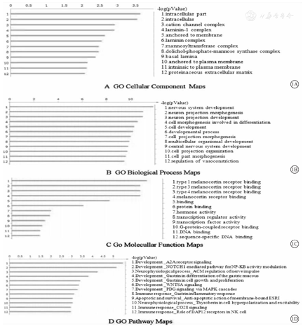 根据甲基化水平(峰值得分)>5,本研究维吾尔族PCOS患者卵巢组织全基因组特异性高甲基化基因为342个。对这些高甲基化基因进行GO分析及Pathway分析的结果显示,PCOS卵巢组织全基因组的特异性高甲基化基因,主要参与受体结合、蛋白质结合、激素活性、转录调节活性、转录因子活性和DNA结合等过程。该分析结果具体如下:①富集度由高到低的前12个参与调控的细胞组分依次为:细胞内域(intracellular part)、细胞内的(intracellular)、阳离子通道复合物(cation channel complex)、层黏连蛋白1复合物(laminin-1 complex)、固定于细胞膜(anchored to membrane)、层黏连蛋白复合物(laminin complex)、甘露糖基转移酶复合物(mannosyltransferase complex)、多萜醇-磷酸-甘露糖合成酶复合物(dolichol-phosphate-mannose synthase complex)、细胞基底层(basal lamina)、固定于细胞质膜(anchored to plasma membrane)、内在的细胞质膜(intrinsic to plasma membrane)、细胞外基质蛋白质(proteinaceous extracellular matrix),见图1A;②富集度由高到低的前12个参与调控的生物学过程依次为:神经系统发育(nervous system development)、神经投射形态发生(nervous projection morphogenesis)、神经投射发育(nervous projection development)、参与细胞形态发生(cell morphogenesis involved)、细胞发育(cell development)、发育过程(developmental process)、细胞投射(cell projection)、多细胞生物发育(multicellular organismal development)、中枢神经系统发育(central nervous system development)、细胞投射组织(cell projection organization)、细胞部分形态发生(cell part morphogenesis)、血管收缩调节(regulation of vasoconstriction),见图1B;③富集度由高到低的前12位参与调控的分子功能依次为:1型黑皮质素受体结合(type 1 melanocortin receptor binding)、3型黑皮质素受体结合(type 3 melanocortin receptor binding)、4型黑皮质素受体结合(type 4 melanocortin receptor binding)、黑皮质素受体结合(melanocortin receptor binding)、结合(binding)、蛋白结合(protein binding)、激素活性(hormone activity)、转录调节活性(transcription regulator activity)、转录因子活性(transcription factor activity)、G蛋白偶联受体结合(G-protein-coupled receptor binding)、DNA结合(DNA binding)、序列特异性DNA结合(sequence-specific DNA binding),见图1C;④富集度由高到低的前12条参与调控的信号通路依次为:发育_A2A受体信号(development_A2A receptor signaling)、发育_NOTCH1介导的NP-KB活性调节途径(development_NOTCH1-mediated pathway for NP-KB activity modulation)、神经生理过程_神经冲动的ACM调节(neurophysiological process_ACM regulation of nerve impulse)、发育_胃黏膜分化中的胃泌素(development_gastrin in differentiation of the gastric mucous)、发育_细胞生长与增值中的胃泌素(development_gastrin in cell growth and proliferation)、发育_WNTSA信号(development_WNTSA signaling)、发育_经由促分裂原活化蛋白激酶级联的PDG信号(development_PDG signaling via MAPK cascades)、免疫应答_胃泌素炎症反应(immune response_gastrin inflammatory response)、细胞凋亡与生存_膜结合ESRI的抗细胞凋亡作用(apoptotic and survival_anti-apoptotic action of membrane-bound ESRI)、神经生理过程_甲状腺素在细胞超极化与兴奋性中的作用(neurophysiological process_thyroxine in cell hyperpolarization and excitability)、免疫应答_CO28信号(immune response_CO28 signaling)、免疫应答_DAP12受体在自然杀伤细胞中的作用(immune response_role of DAP12 receptors in NK cell),见图1D。维吾尔族PCOS患者卵巢组织特异性高甲基化基因的GO分析及Pathway分析丰度统计条图,见图1。