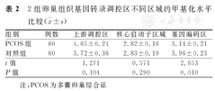 2组卵巢组织基因转录调控区的上游调控区和核心启动子区域甲基化水平比较,差异均无统计学意义(P>0.05)。PCOS组转录调控区的基因编码区甲基化水平低于对照组,并且差异有统计学意义(P<0.05)。2组卵巢组织基因转录调控区不同区域的甲基化水平比较,见表2。