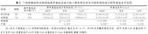 注:a由于P值接近0.05,采用秩和检验进一步进行比较后,确认为P<0.05。PCOS为多囊卵巢综合征。HCP为高-CpG含量启动子,ICP为中-CpG含量启动子,LCP为低-CpG含量启动子,CpG为胞嘧啶-磷酸-鸟嘌呤