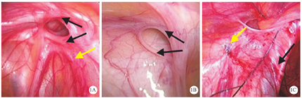 腹腔镜组患儿中,7例术中内环口未发现明显瘢痕,5例可见初次手术结扎线所致的瘢痕,位于腹股沟内环口处(图1A、图1B);6例术中可见输精管未紧贴内环口腹膜(图1C)。复发性腹股沟斜疝患儿腹腔镜内环结扎术术中照片,见图1。