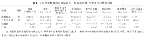 2组复发性腹股沟斜疝患儿一般临床资料、术中及术后情况比较