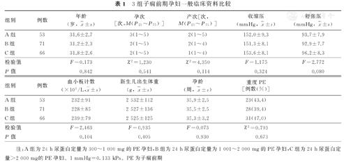 本研究纳入的190例PE孕妇,24 h尿量为1 240~3 010 mL;24 h尿蛋白定量为302~7 342 mg;尿蛋白与肌酐比值为0.31~5.60。3组PE孕妇的年龄、孕次、产次、收缩压、舒张压、血小板计数、新生儿出生体重、孕龄及重度PE所占比例比较,差异均无统计学意义(P>0.05)。3组PE孕妇一般临床资料比较,见表1。