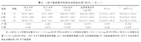 3组孕妇LDH、血尿素氮水平及APTT分别总体比较,差异均有统计学意义(P<0.05)。3组孕妇AST、ALT水平及和PT分别总体比较,差异均无统计学意义(P>0.05)。3组PE孕妇的生化指标比较,见表2。