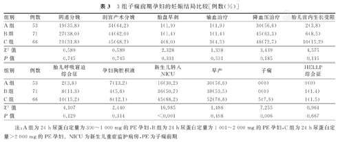 本研究结果亦显示,C组(24 h尿蛋白定量>2 000 mg)PE孕妇占35%,其中,重度PE占62.1%(41/66),并且3组孕妇重度PE所占比例总体比较,差异无统计学意义(P>0.05)。这提示,PE孕妇严重程度不能仅通过24 h尿蛋白定量进行判断。但是,PE孕妇一旦发生24 h尿蛋白定量升高时,应警惕母婴不良妊娠结局的发生。
