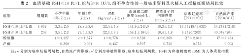 | FSH≥10 IU/L组 | 203 | 3.5±2.3 | 29.5±3.9 | 22.1±3.3 | 159.1±164.4 | 10.4±4.8 | 9.9(20/203) | 40.0(8/20) |