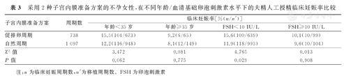 采用2种子宫内膜准备方案的不孕女性,在不同年龄/血清基础卵泡刺激素水平下的夫精人工授精临床妊娠率比较