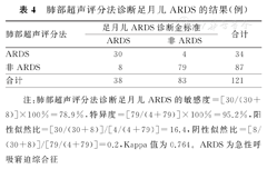 采用肺部超声评分法对本研究121例足月儿进行ARDS诊断的结果显示,肺部超声评分法对足月儿ARDS诊断的敏感度为78.9%,特异度为95.2%;阳性似然比为16.4,阴性似然比为0.2;Kappa值为0.764,肺部超声评分法与ARDS诊断金标准对足月儿ARDS的诊断一致性较高。肺部超声评分法诊断足月儿ARDS的结果,见表4。