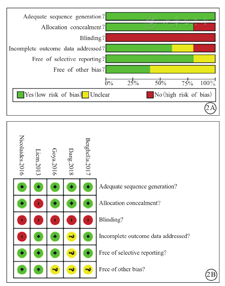 注:dequate sequence generation为随机分配方案产生,allocation concealment为分配方案隐藏,blinding为双盲,incomplete outcome data addressed为强调结果数据的不完整性,free of selective reporting为无选择性报告偏倚,free of other bias为无其他偏倚