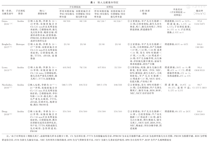 | Liem, 2013[16] | Arabin | ①纳入标准:孕龄为16~20孕周,双胎妊娠合并CL<38 mm;②排除标准:胎儿具有严重先天畸形,胎儿死亡,TTTS,前置胎盘 | 401/802 | 78/156 | 407/814 | 55/110 | ①主要指标:死胎、新生儿脑白质软化、重度RDS、IVH、NEC、BPD、脓毒症、新生儿死亡;②次要指标:早产儿出生胎龄<32周或者<37周、NICU治疗、住院天数、产妇死亡率 | 阴道排液:26% vs 0,疼痛:4% vs <1%,阴道排液伴疼痛:3% vs 0,发热或感染:2% vs 1% | 99.4(808/813) |