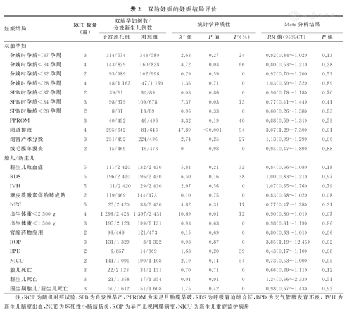 | 项目 | RCT数量(篇) | 双胎孕妇例数/分娩新生儿例数 | 统计学异质性 | Meta分析结果 | |||||