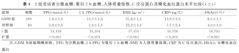 GDM组孕妇FPG、2 h PPG、BMI、CRP及HbA1c水平,均显著高于对照组,并且差异均有统计学意义(P<0.001)。2组受试者上述指标比较,见表1。