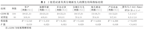 GDM组孕妇早产、胎膜早破、羊水过多、分娩巨大儿、胎儿窘迫及产后出血发生率,均显著高于对照组,GDM组孕妇分娩新生儿的1 min Apgar评分,显著低于对照组健康孕妇分娩新生儿,并且差异均有统计学意义(P<0.05)。2组受试者及其分娩新生儿的围生结局指标比较,见表2。