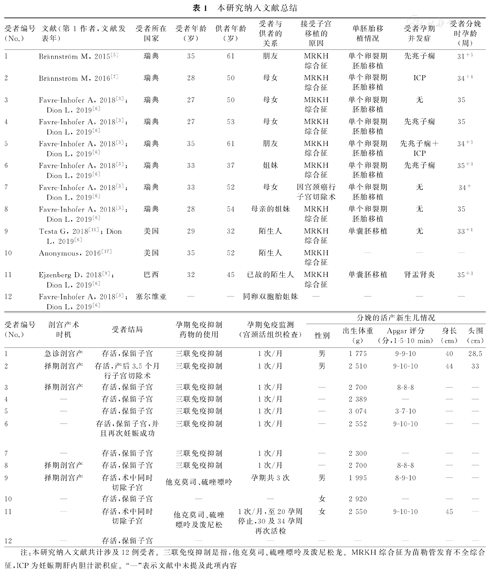 注:本研究纳入文献共计涉及12例受者。三联免疫抑制是指,他克莫司、硫唑嘌呤及泼尼松龙。MRKH综合征为苗勒管发育不全综合征,ICP为妊娠期肝内胆汁淤积症。"—"表示文献中未提及此项内容