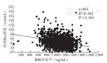 采用直线回归分析方法,对483例受试者早、中、晚孕期血清Hcy浓度与RBCF水平进行相关性分析的结果显示,二者呈线性负相关关系,建立的直线回归方程为y =-0.003x +7.986(R2=0.082,F=129.669,P<0.001),其中x为RBCF水平(ng/mL),y为血清Hcy浓度(μmol/L)。本研究483例受试者早、中、晚孕期血清Hcy浓度与RBCF水平直线回归关系散点图,见图1。